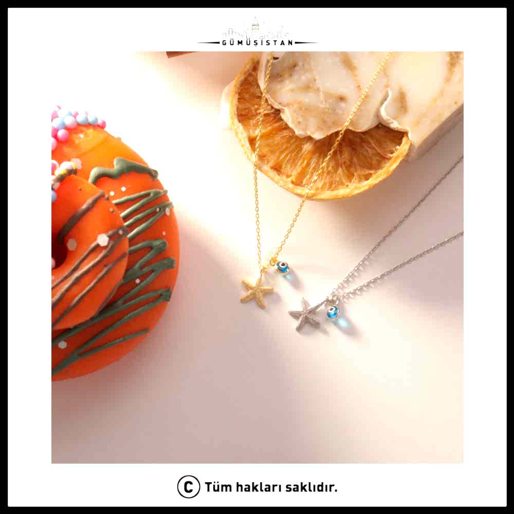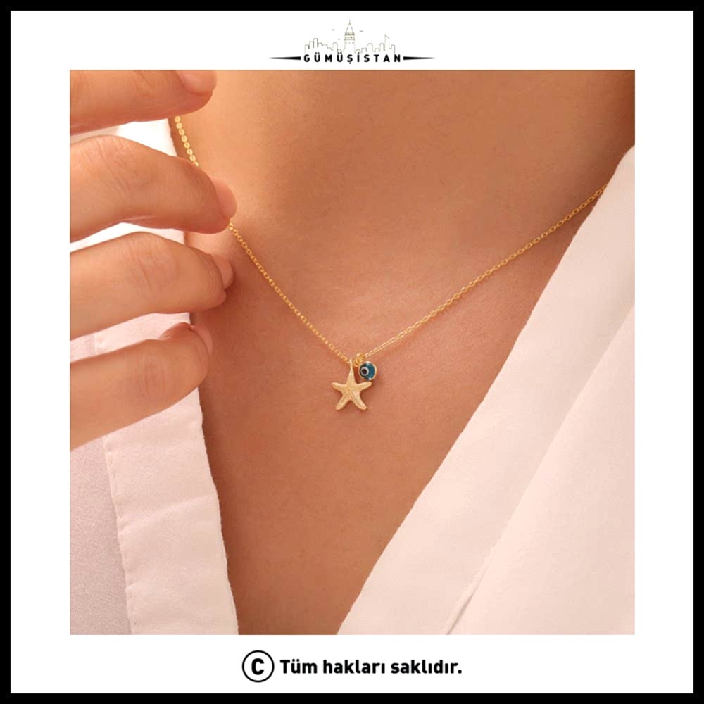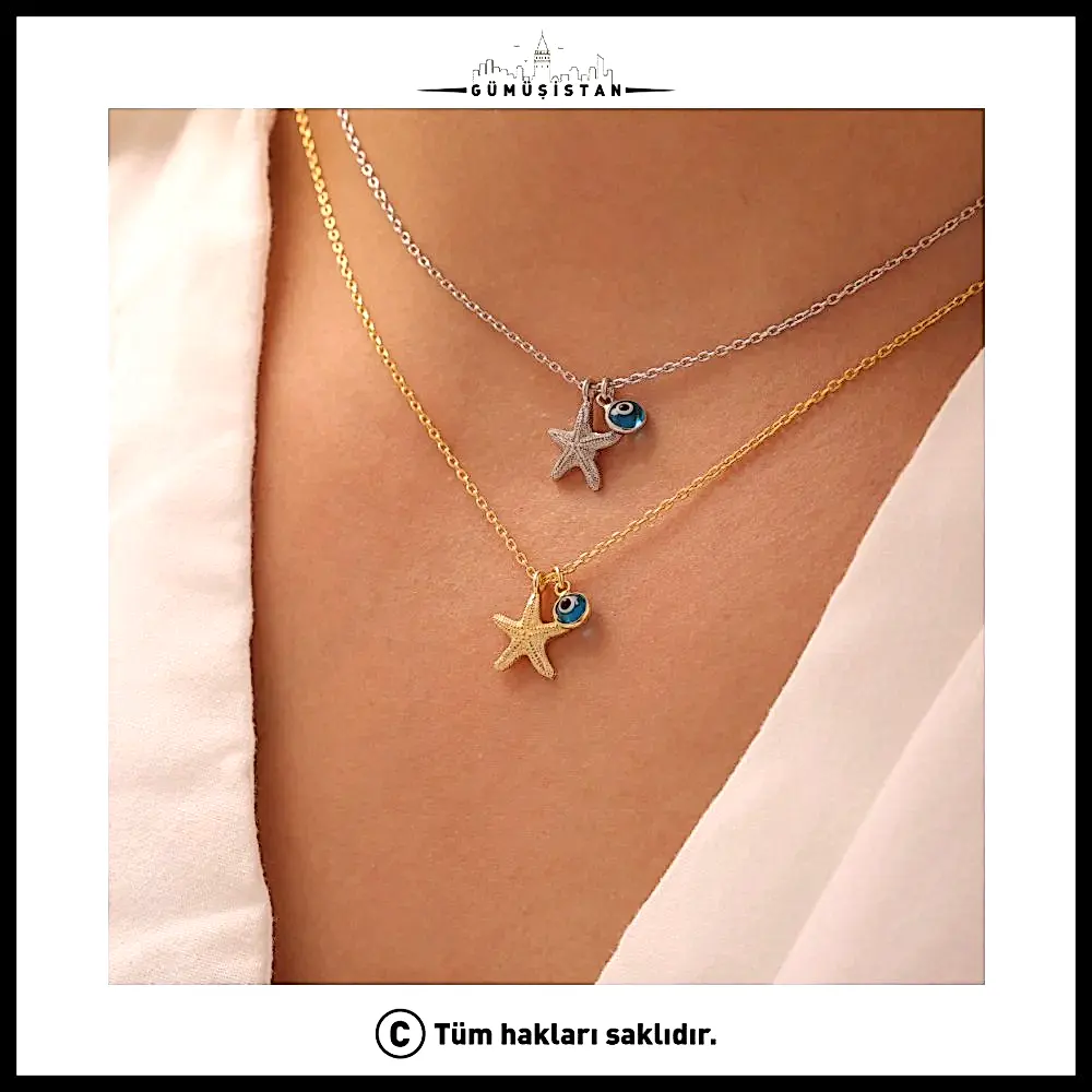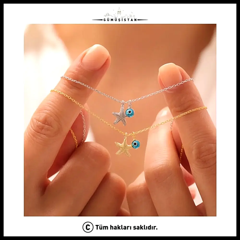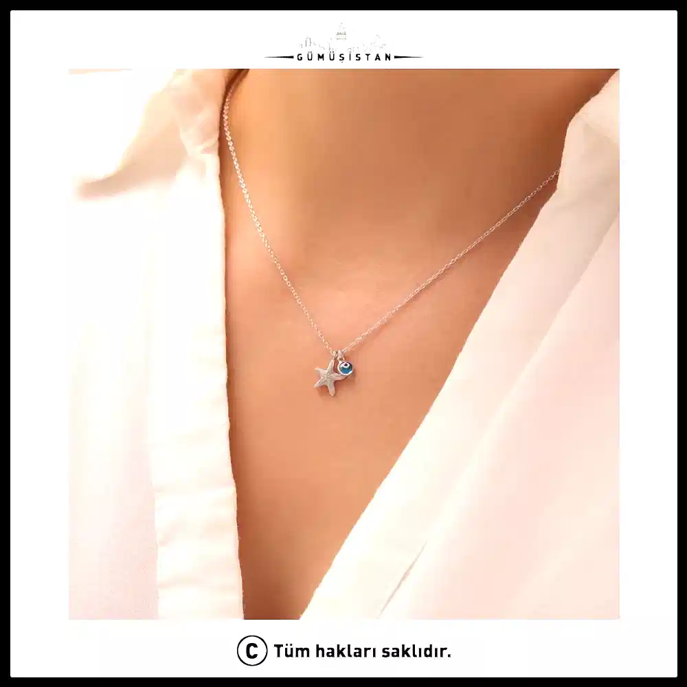 Denizin büyüsünü ve nazar boncuğunun koruyucu enerjisini bir araya getiren bu özel tasarım, şıklığıyla göz kamaştırıyor. 925 ayar gümüşten üretilen nazarlı deniz yıldızı kolye, hem yaz ruhunu hem de zarafeti boynunuza taşıyor.