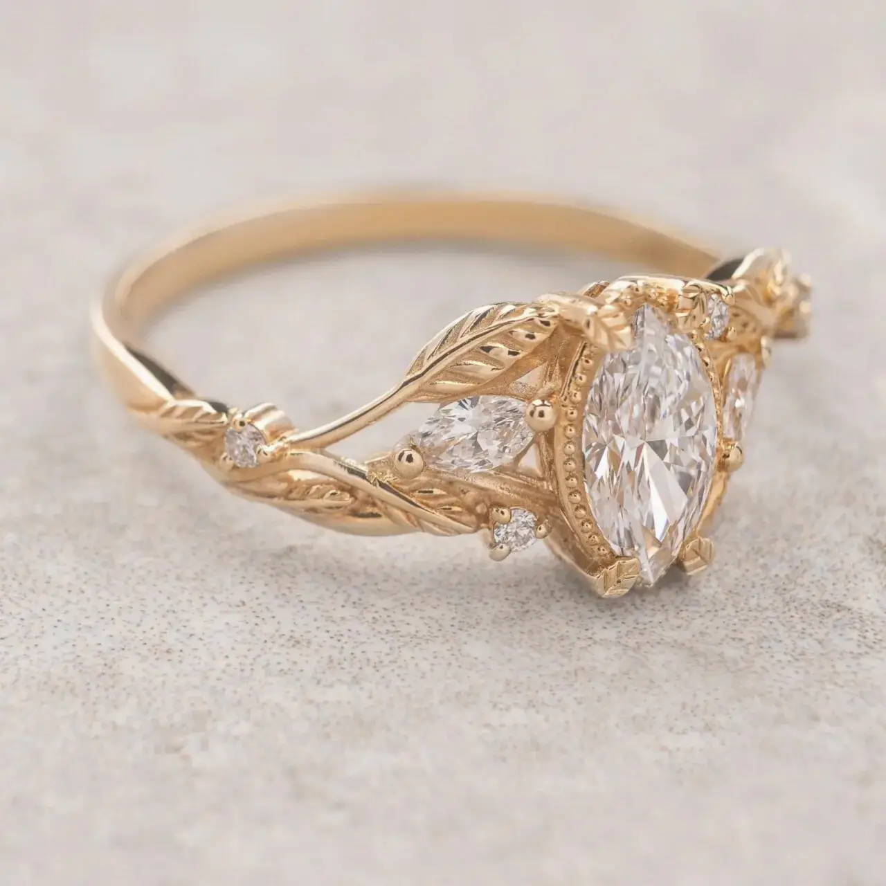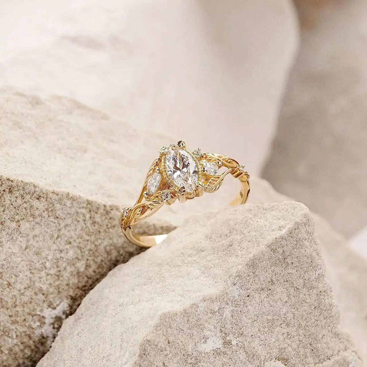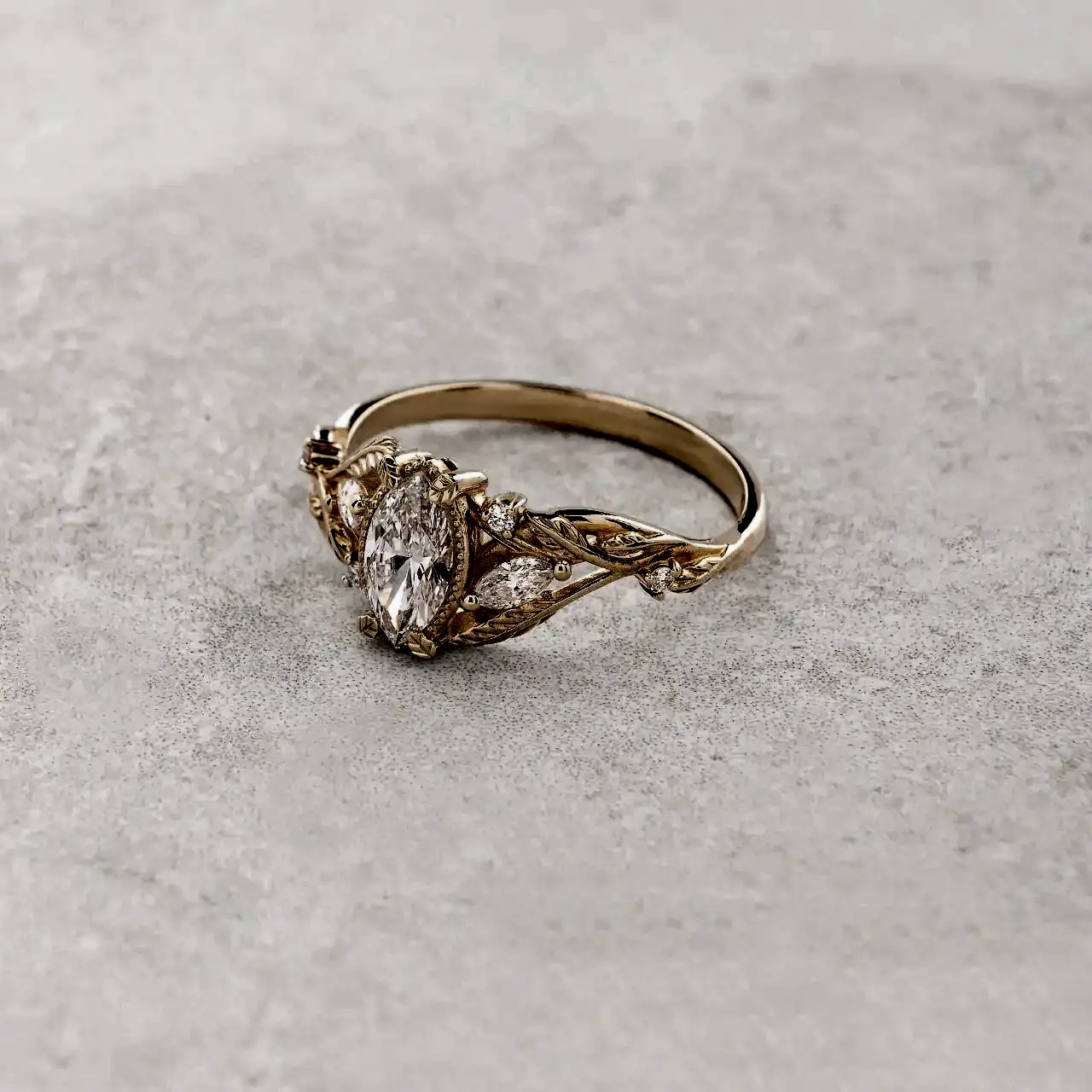 Zarafetiyle doğayı taklit eden bir formda tasarladığımız bu özel yüzük, markiz kesim tektaş pırlanta ve onu çevreleyen zarif sarmaşık detaylarıyla benzersiz bir uyum sunuyor.