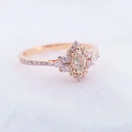 Markiz pırlanta, asaletin ve ince zevkin simgesi olarak, özellikle parmak boyunu daha uzun ve zarif göstermek isteyenlerin tercihi. Bu yüzüğün en dikkat çekici yönü ise tamamen el işçiliğiyle şekillendirilmiş sarmaşık desenli formu — tıpkı bir duygunun zamanla büyüyüp birine sarılması gibi…