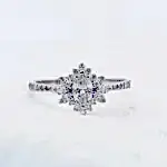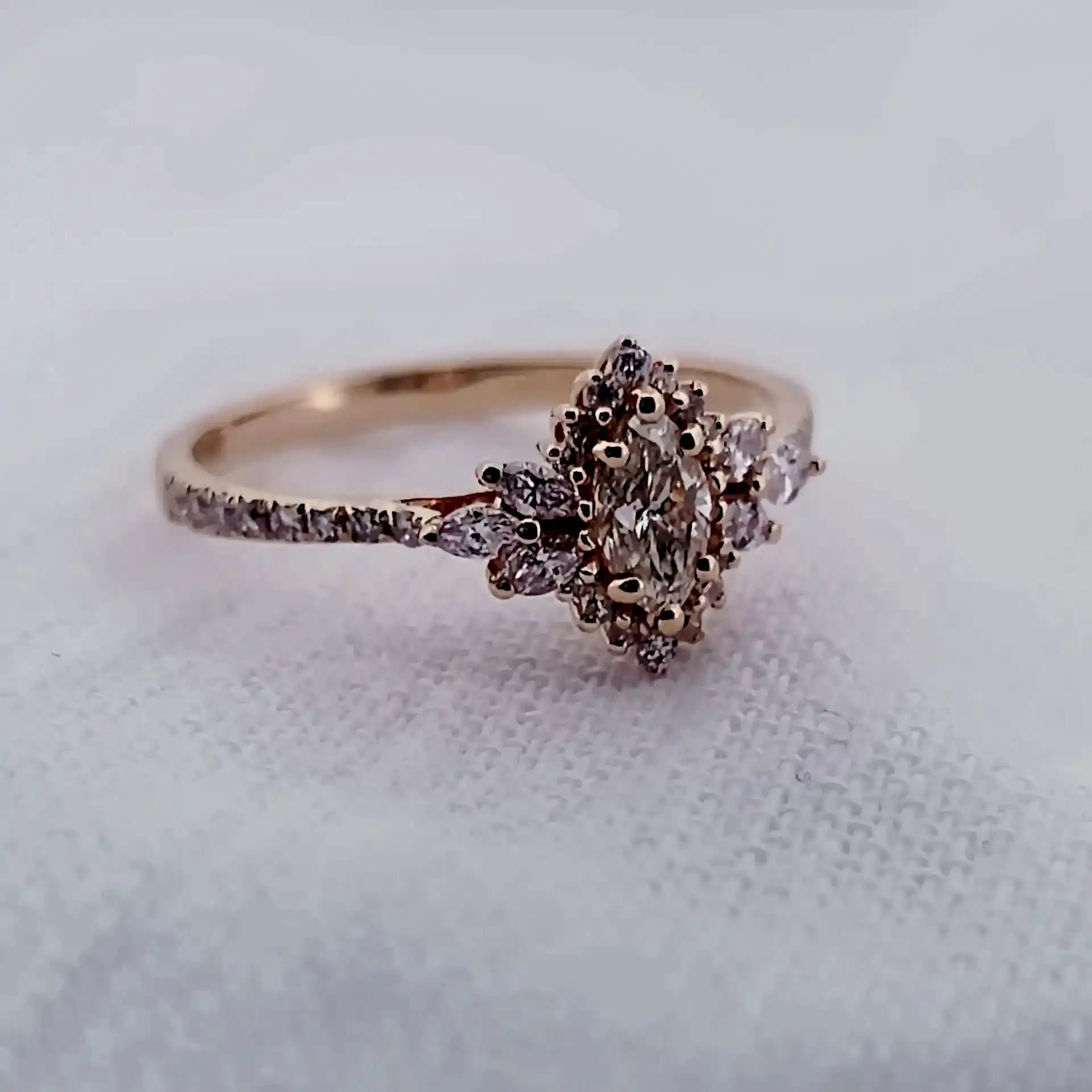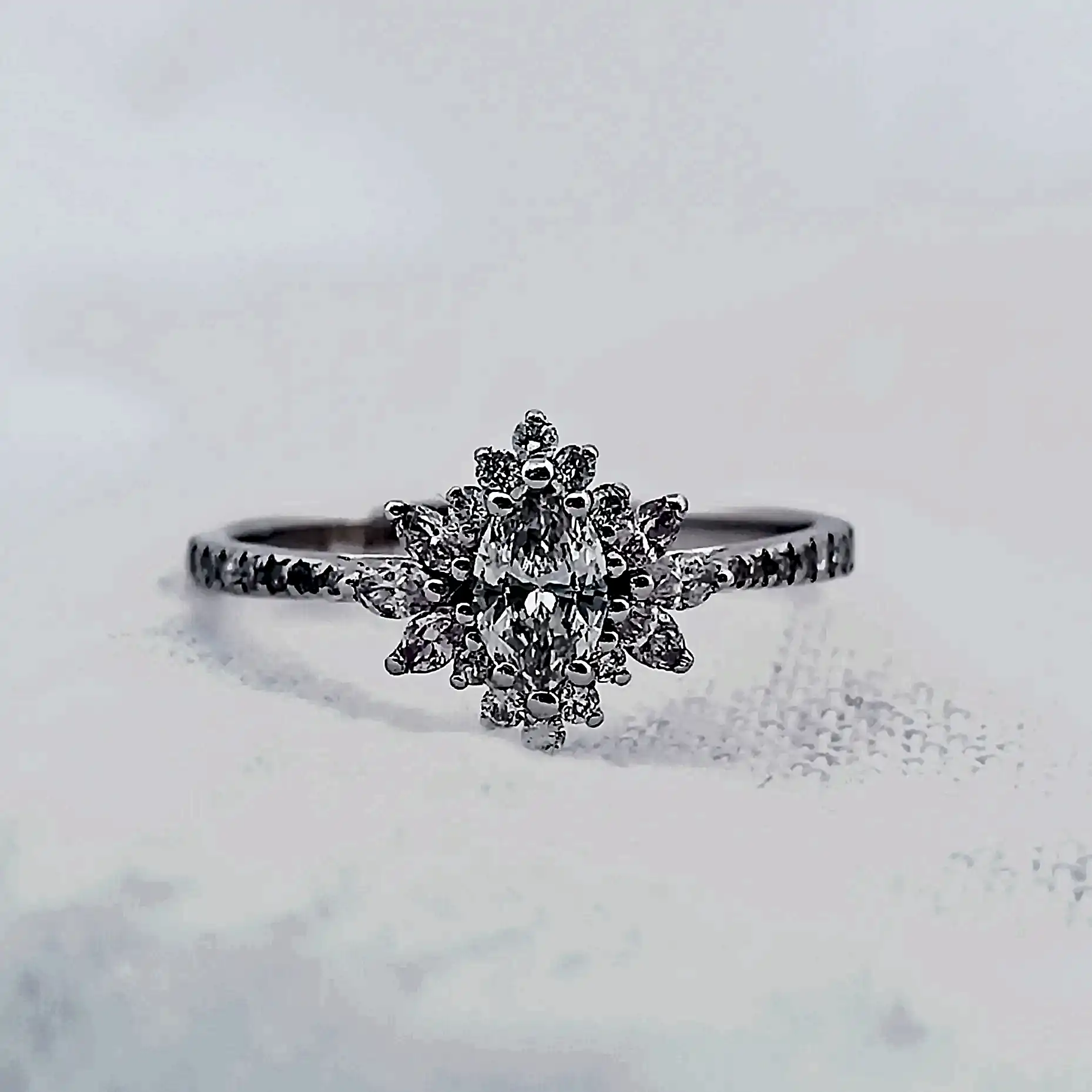 Yaprak detaylarıyla zarifçe tasarlanmış, yanlarında üçer adet markiz pırlanta bulunan özel tasarım tektaş markiz pırlanta yüzük, şıklığın ve asaletin simgesi.